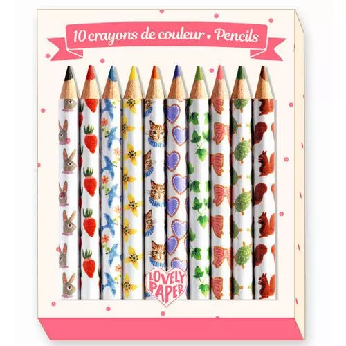 Een kartonnen doosje met 10 kleine kleurpotloden met een vrolijke decoratie uit de lijn Lovely Paper van het Franse merk Djeco om elk moment van de dag kleur te geven.