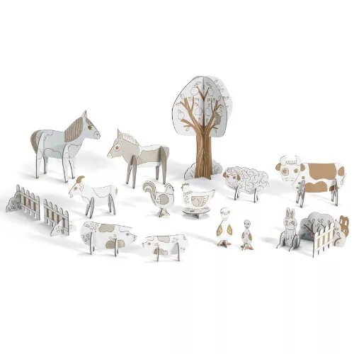 Niets zo leuk als zelfgemaakt speelgoed. Met deze DIY knutselset ‘Farm’ van het Franse merk Djeco maken kinderen hun eigen 3D boerderijfiguren.