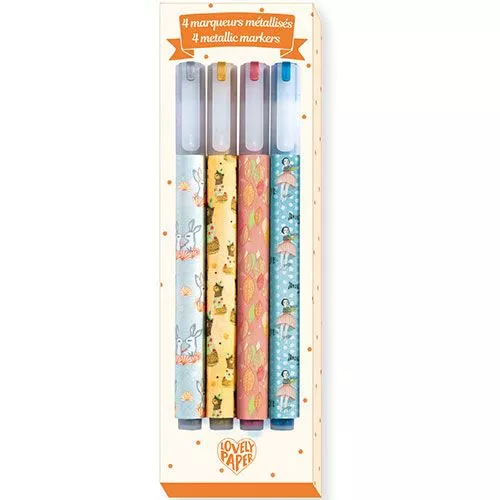 Een set met 4 metallic stiften van het Franse merk Djeco om mooie accenten op tekeningen aan te brengen of om mee te schrijven.