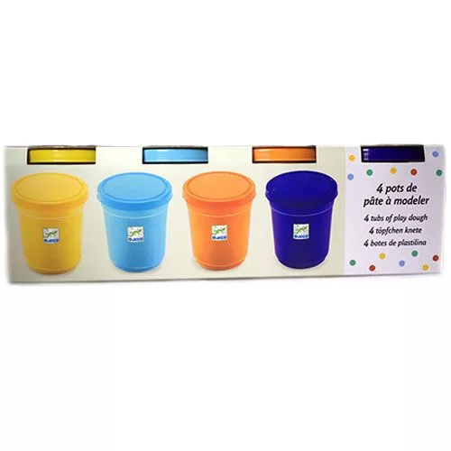 Een set met zachte boetseerklei van het Franse merk Djeco in de kleuren blauw, oranje, lichtblauw en geel. Een rustige kleurenmix om heerlijk in te kneden en vorm te geven.