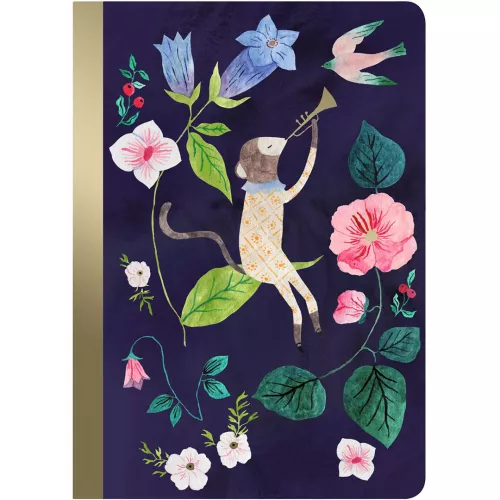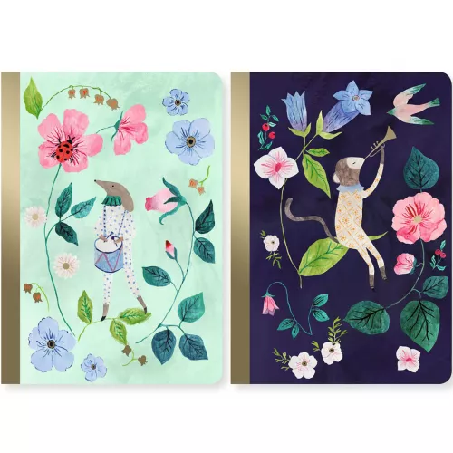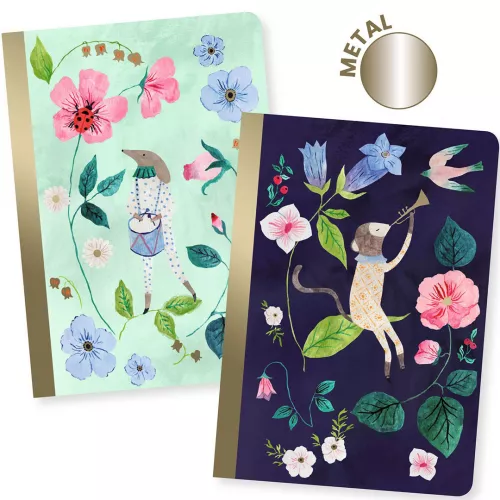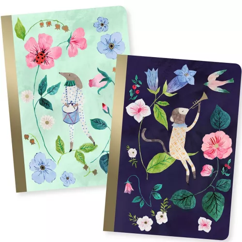 Twee fleurige A6 notitieboekjes ‘Cecile Little Notebooks’ uit de lijn Lovely Paper van het Franse merk Djeco. Op de voorkant mooie illustraties van muzikale dieren met metallic details en een gouden rand. Handzame schriftjes voor aantekeningen of kleine tekeningen.