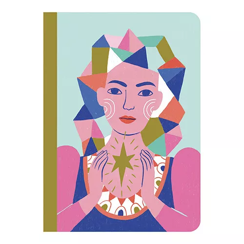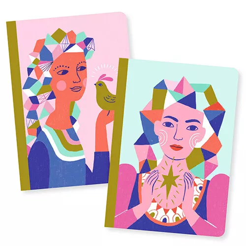 Twee handzame A6 notitieboekjes ‘Sarah Little Notebooks’ uit de lijn Lovely Paper van het Franse merk Djeco met op de voorkant kleurrijke illustraties van een vrouw met een vogel of ster met metallic details. Eén notebook heeft blanco papier en het andere boekje is gelinieerd, met op elke pagina een klein tekeningetje.