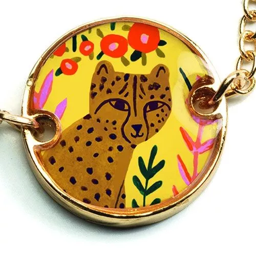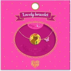Een kinderarmbandje ‘Feline’ van het Franse merk Djeco. Dit sierlijke armbandje met een gouden, metalen ketting heeft twee bedeltjes: een vriendelijke luipaard en een paarse vlinder.