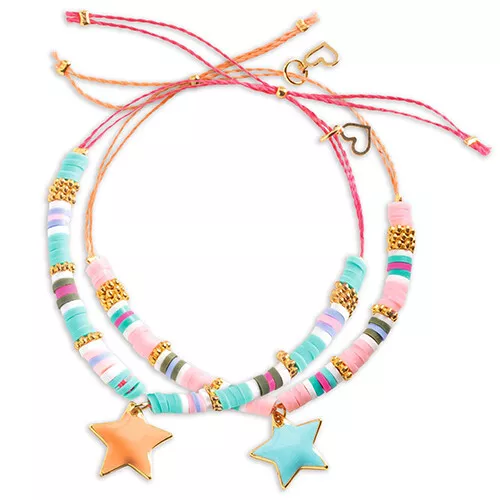 Maak twee armbanden met de pastelkleurige kralen en sterren bedels uit de knutselset ‘You & Me – Star Heishi’ van het Franse merk Djeco. Een creatieve knutselset om alleen mee aan de slag te gaan, of om samen met een vriendin vriendschapsarmbandjes te maken.