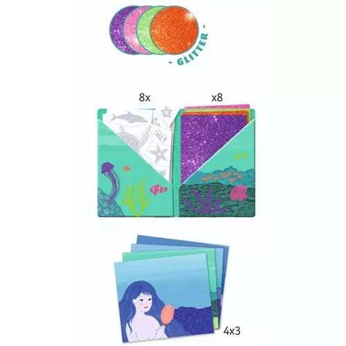 Dit creatieve kindersetje werkt als volgt: plak de lijmsjablonen op de kaart, en hou vervolgens één van de glitterkaarten tegen de lijmrand. Glinsterende patronen zullen op de kaarten verschijnen!
