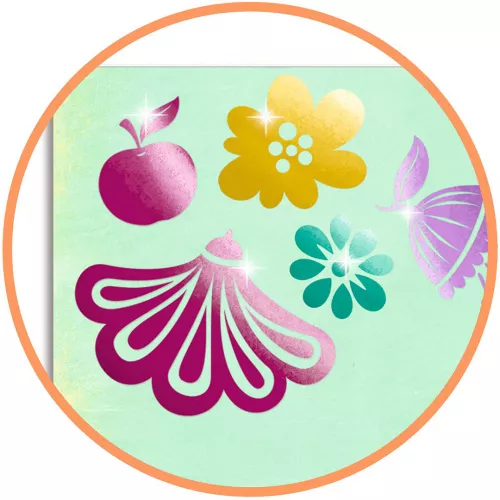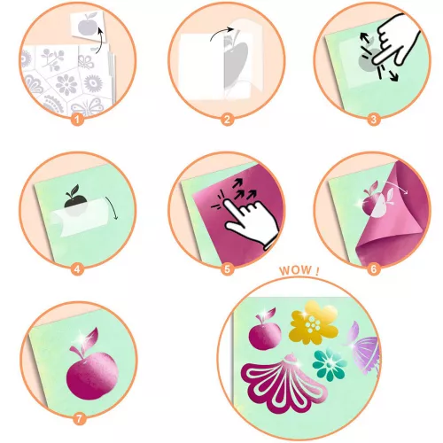 Dit creatieve kindersetje werkt als volgt: plak de lijmsjablonen op de kaart, en hou vervolgens ƩƩn van de metallic kaarten tegen de lijmrand. Glinsterende metallic patronen zullen op de kaarten verschijnen.