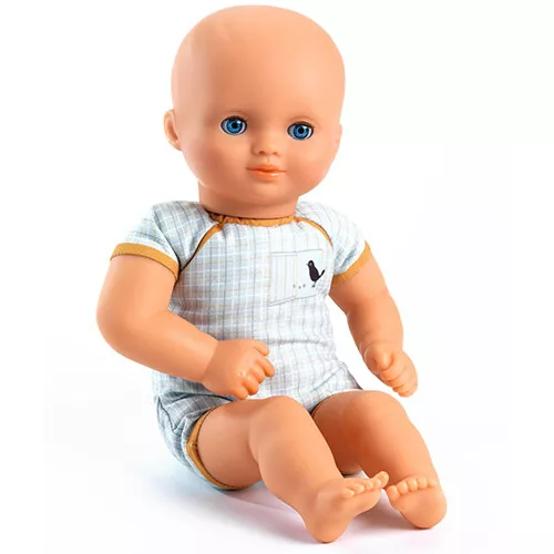 Babypop ‘Canary’ van het Franse merk Djeco wordt graag geknuffeld en vertroeteld. De armen, benen en het beweegbare hoofd van de pop zijn gemaakt van vinyl. Het zachte lijfje ziet eruit als een rompertje. Zijn slaperige, blauwe oogjes sluiten wanneer de speelgoedpop wordt toegedekt voor een dutje.