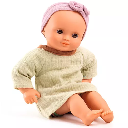 Babypop ‘Pistache’ van het Franse merk Djeco wordt graag geknuffeld en vertroeteld. De armen, benen en het beweegbare hoofd van de pop zijn gemaakt van vinyl. Het zachte lijfje ziet eruit als een rompertje. Haar slaperige, bruine oogjes sluiten wanneer de speelgoedpop wordt toegedekt voor een dutje.