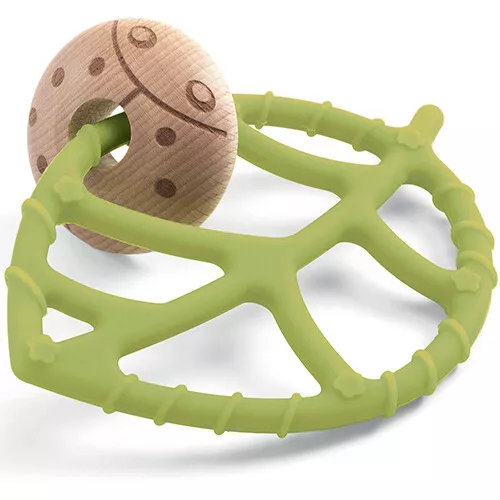 Bijtspeelgoed in de vorm van een blad met houten lieveheersbeestje ‘BabyGreeni’ van het Franse merk Djeco. Door de verschillende materialen en het reliëf op het blad is het geweldig voor de baby om er in te bijten en af te tasten.