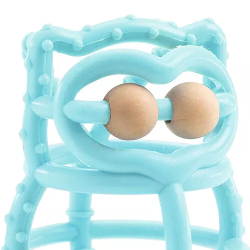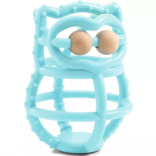 Een siliconen bijtspeeltje in de vorm van een uil ‘BabyBoo’ van het Franse merk Djeco. Het bijtspeelgoed heeft twee houten kralen en verschillende rondingen waarop gekauwd kan worden. De reliëfs van het bijtspeelgoed masseren het tandvlees. Dat verzacht de pijn van doorkomende tandjes.