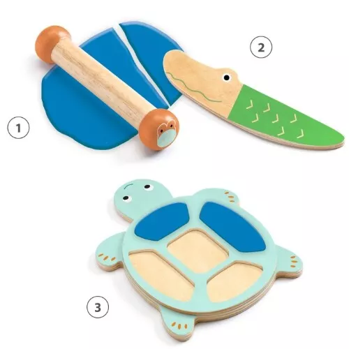 Kinderen gebruiken de houten roller om de klei uit te rollen. Vervolgens gebruiken ze de houten snijder om partjes klei uit te snijden die precies op het schild van de schildpad passen.Ā