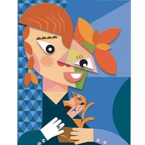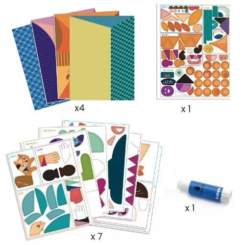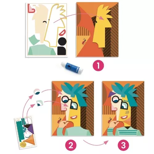 Kinderen gebruiken de voorgesneden kartonnen vormen en papieren stickers uit dit knutselpakket om net als Picasso kubistische collages te maken. Hiervoor kunnen zij de voorbeelden uit het bijgeleverde instructieboekje volgen, of hun eigen portretten maken.