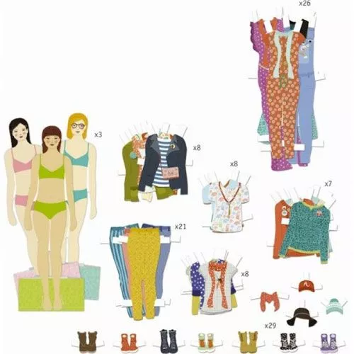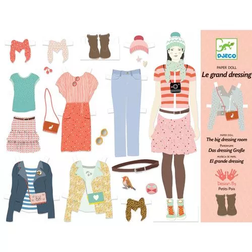 Ontdek de kledingkast van een meisje! De Grote verkleedpartij van het merk Djeco is een garderobe vol met papieren kledingstukken, en het is aan jou om een outfit te kiezen voor de drie meiden! Elk kledingstuk is bijzonder trendy en geheel voorgeknipt, je hoeft alleen nog te kiezen, te vouwen en aan te trekken!
