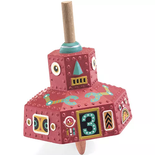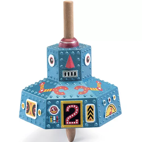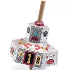 Een klassiek draaitolletje in een nieuw jasje ‘Robot spinning top’ van het Franse merk Djeco. Laat de tol draaien en de stoere metallic robot draait razendsnel in het rond.