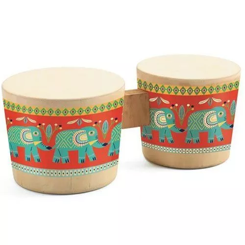 Een dubbele houten trommel van het Franse merk Djeco. Een vrolijke muziekinstrument versierd met kleurrijke olifanten voor de groeiende muzikant! De twee trommels zitten aan elkaar bevestigd.