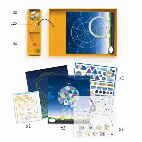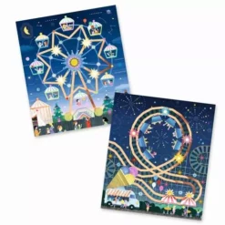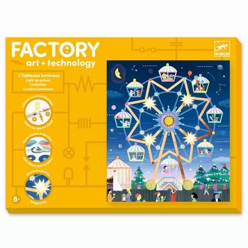 Met een geleidende lijmstrip, batterijen en LED’jes kan het kind zelf elektrische schakelingen aanleggen om zo een spoor van licht over de kermisafbeeldingen te trekken. De bijgeleverde stickers om de lichtkaarten mee te versieren maken de bijzondere schilderijtjes helemaal af.