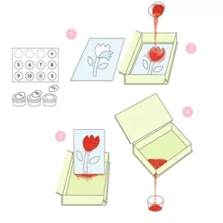 Op één van de 4 voorbedrukte schilderijtjes worden eerst dezelfde nummers opengemaakt met het bijgesloten spateltje-lepeltje van kunststof. Op deze plakkerige plekken kan het gekleurde zand met hetzelfde nummer gestrooid worden. Is het klaar, dan kan het overtollige zand eenvoudig in de doos met een gaatje in de hoek teruggestrooid worden en weer in het potje gedaan worden.