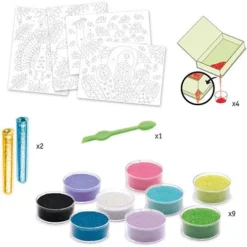 – een set van 9 doorzichtige potjes met gekleurd zand en 2 buisjes met glitters,