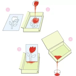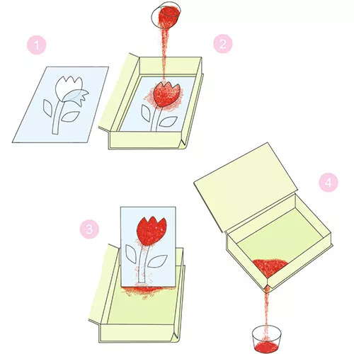 Op één van de 4 voorbedrukte schilderijtjes wordt eerst de stickers met hetzelfde nummer opengemaakt met het bijgesloten spateltje-lepeltje van kunststof. Op deze plakkerige plekken kan het gekleurde zand met hetzelfde nummer gestrooid worden. Is het klaar, dan kan het overtollige zand in de doos, met een gaatje, teruggestrooid worden en weer in het potje gedaan worden.