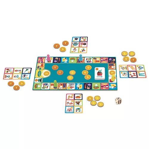 Om het kinderspel ‘P’tit Market’ van het Franse merk Djeco te winnen hebben kinderen een beetje geluk nodig, maar dienen ze vooral slim om te gaan met geld. Wie heeft als eerste alle boodschappen van het lijstje verzameld?