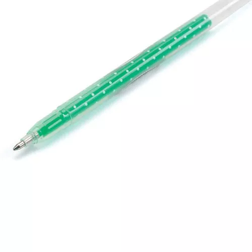 De set bevat gelpennen in de kleuren groen, blauw, paars, roze, geel en zilver.