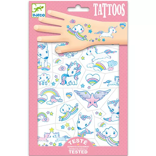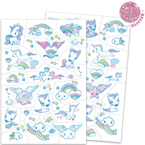 Sprankelende kindertattoos met glitters ‘Unicorns’ van het Franse merk Djeco om de huid mee te versieren. De twee vellen bevatten 69 plaktattoos van glinsterende eenhoorns, wolkjes en regenbogen voor een betoverend effect.