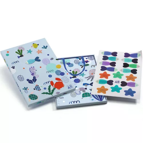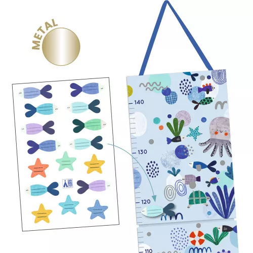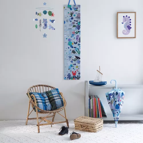 Een kartonnen groeimeter ‘Aquatic life’ uit de serie Little BIG room van het Franse merk Djeco, om bij te houden hoe snel de kleine peuter groeit! De kartonnen groeimeter is versierd met metallic details en decoratieve onderwaterdieren.