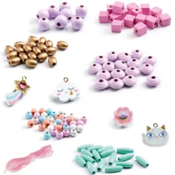 Een houten kralenset met 400 gevarieerde kralen ‘Rainbow’ van het Franse merk Djeco om creatief aan de slag te gaan met armbandjes en kettingen.