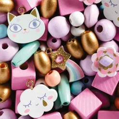 – pastelkleurige en metallic houten kralen in verschillende vormen