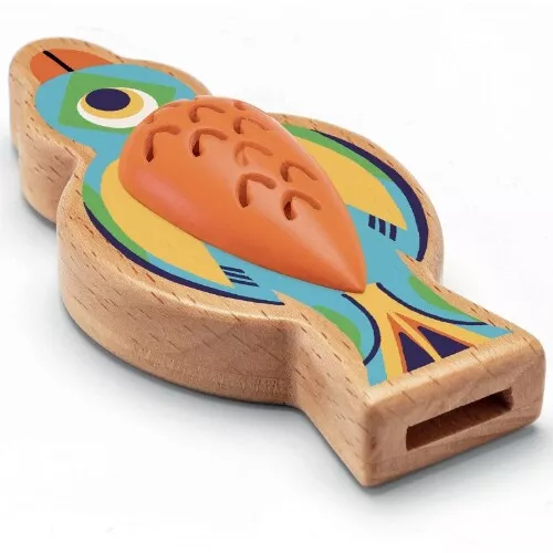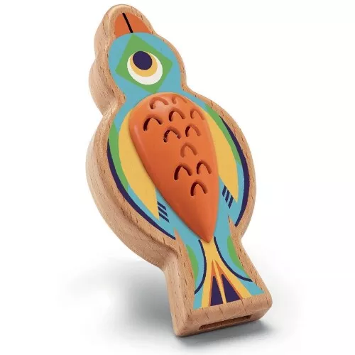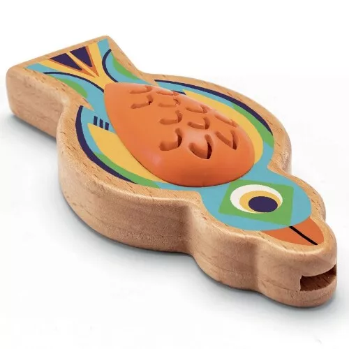 Een vrolijke kazoo uit de instrumentenserie Animambo van het Franse merk Djeco. In plaats van blazen neurieen, zingen of praten kinderen in het instrument. De trillingen van de stem produceren het geluid.