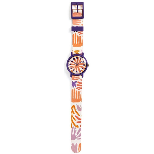 Een kleurrijk kinderhorloge ‘Watch – Leaves’ uit de serie Ticlock van het Franse merk Djeco. Het horloge met stoffen bandje en kunststof gesp heeft een urenwijzer en een secondewijzer. De horlogeband en wijzerplaat zijn versierd met blaadjes.