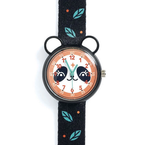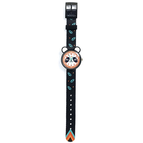 Een groen en oranje kinderhorloge met berenoortjes ‘Watch – Panda’ uit de serie Ticlock van het Franse merk Djeco. Het horloge met stoffen bandje en kunststof gesp heeft een urenwijzer en een secondewijzer. De horlogeband is versierd met witte bolletjes. Op de wijzerplaat staat een ondeugend wasberensnoetje.