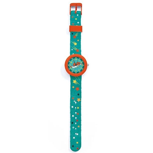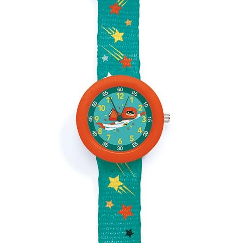 Een zeegroen en rood kinderhorloge ‘Watch – Superhero’ uit de serie Little BIG Room van het Franse merk Djeco. Het horloge met stoffen bandje en kunststof gesp heeft een urenwijzer en een secondewijzer. De horlogeband is versierd met gekleurde sterren. Op de wijzerplaat staat een superheld.
