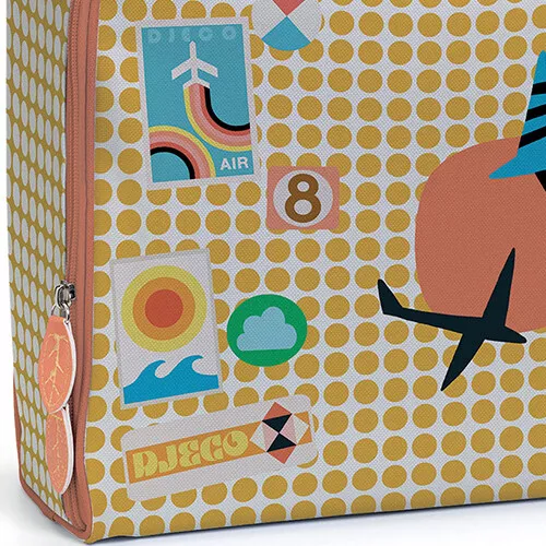Een vrolijke katoenen kinderkoffer ‘Graphic’ in draagbaar formaat van het Franse merk Djeco, met een kleurrijk grafisch dessin met vakantie-thema.