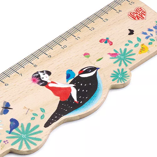 Een kleine, houten meetlat met een vriendelijk vogelmeisje, vlinders en bloemetjes ‘Chic’ uit de Lovely Paper collectie van het Franse merk Djeco. Een kinderliniaal om te meten en rechte lijnen te tekenen op het kinderbureau of om mee te nemen in een etui.