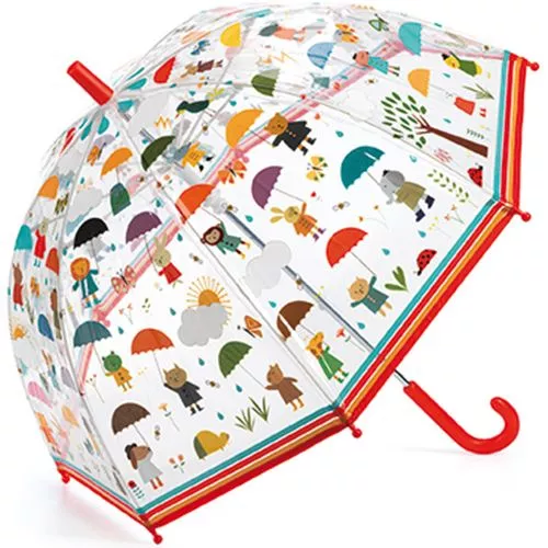 Een doorzichtige kinderparaplu Sous la pluie uit de serie Little Big Room van het merk Djeco. De paraplu heeft schattige afbeeldingen van diertjes met paraplu’s in mooie warme kleuren. Met deze paraplu stapt de kleine graag buiten in de regen.