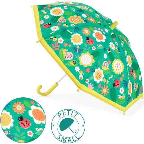 Een groene kinderparaplu ‘Petites Bêtes’ uit de serie Little Big Room van het Franse merk Djeco. De peuter stapt graag de regen in met deze kinderparaplu vol prachtige illustraties van insecten en bloemen