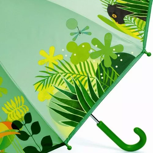 Een kinderparaplu uit de serie Little Big Room van het merk Djeco met tropische planten en dieren in heldere kleuren. Met deze paraplu stapt de kleine graag buiten in de regen.