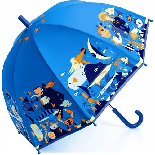 Een kinderparaplu uit de serie Little Big Room van het merk Djeco met zeedieren in heldere, sprekende kleuren. Met deze paraplu stapt de kleine graag buiten in de regen.