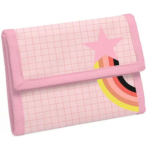 Het zakgeld is veilig opgeborgen in deze roze kinderportemonnee ‘Pop’ van het Franse merk Djeco met een afbeelding van een vallende ster.