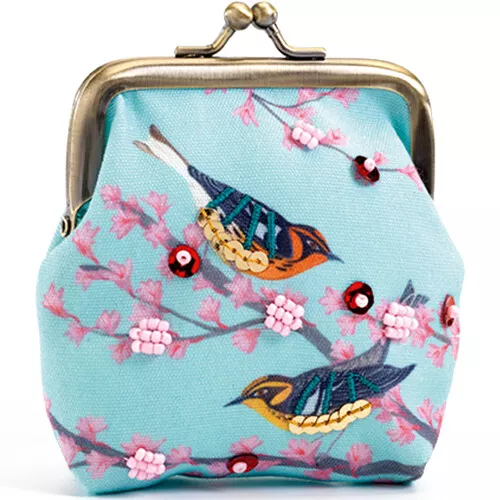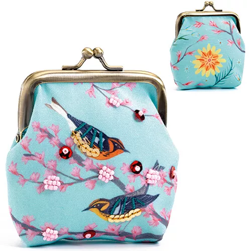 De snuisterijen zijn veilig opgeborgen in deze katoenen kinderportemonnee ‘Lovely Purse – Birds’ van het Franse merk Djeco. De buidel met sierlijke vogeltjes, geborduurde details en kraaltjes sluit met een retro beugelsluiting.