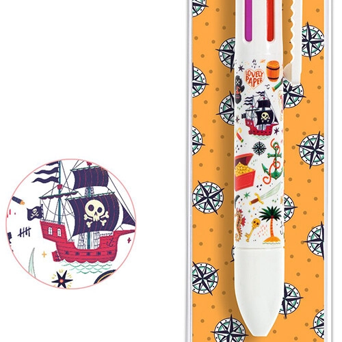 De meerkleurenpen met stoere piraten schrijft in zes verschillende kleuren inkt; rood, roze, paars, blauw, groen en oranje.