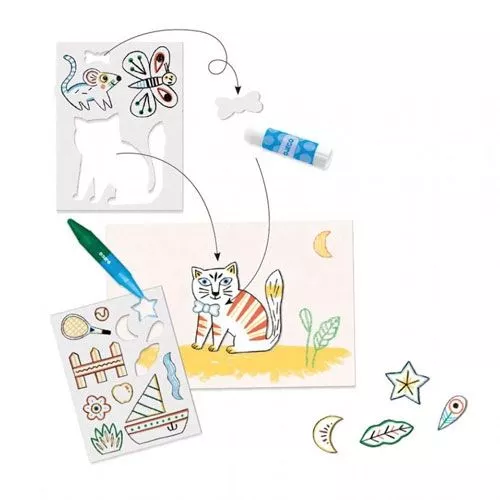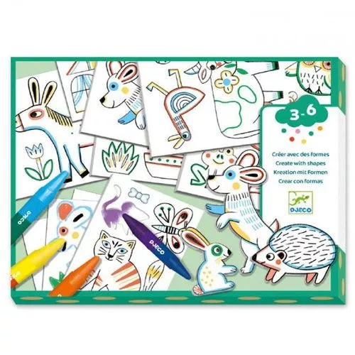 Druk de vormen uit het karton, kleur ze in, plak ze op één van de zes kleurrijke platen en maak een eigen beeldverhaal met dit knutselpakket ‘Créer avec 80 formes – un monde à créer, animaux’ van het Franse merk Djeco. Maak een dierenfeestverhaal of een verhaal bij de vijver. Er is een boekje met voorbeelden bijgevoegd.