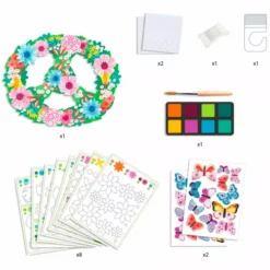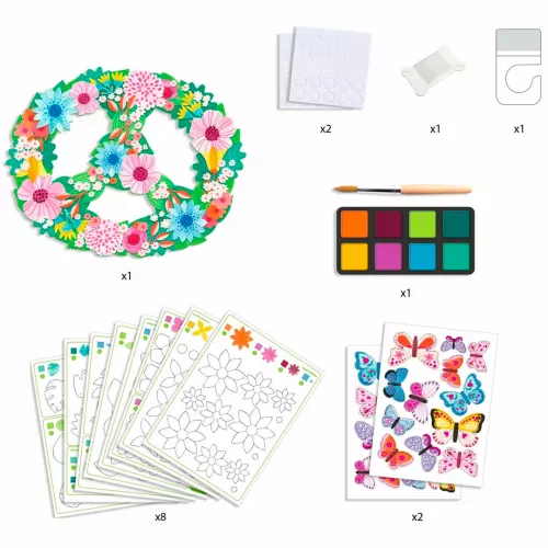 Om de mobiel te maken beschilderen kinderen eerst de losse bloemen en bladeren, om deze vervolgens aaneen te rijgen tot een bloemenslinger. Nadat de slingers gemaakt zijn hoeven ze alleen nog maar vastgemaakt te worden aan de mobiel. Als finishing touch kunnen kinderen de mobiel versieren met glimmende, metallic vlinders.