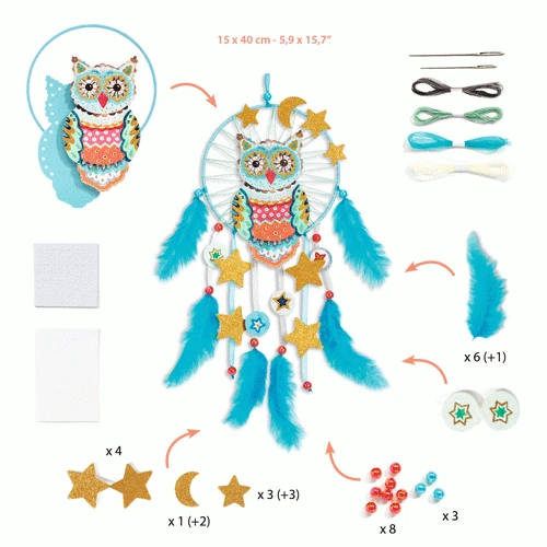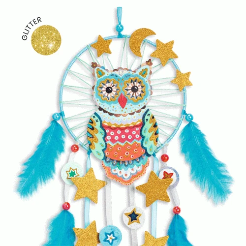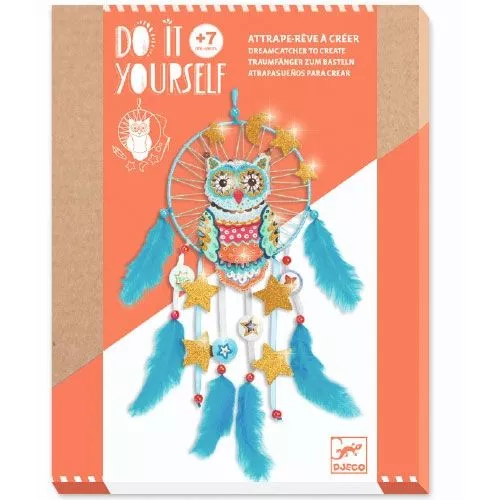 Maak een sprookjesachtige dromenvanger met deze Do It Yourself knutselset ‘Golden Ow!’ van het Franse merk Djeco. Vlecht eerst zelf de dromenvanger volgens de instructies en versier deze met sterren, linten, veren, kralen en de kleurrijke uil.