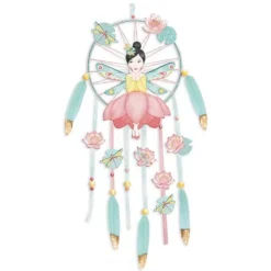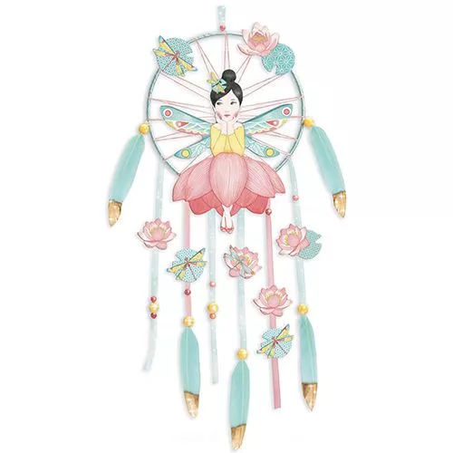 Maak een feeërieke dromenvanger met deze Do It Yourself knutselset ‘Lotus Fairy’ van het Franse merk Djeco. Vlecht eerst zelf de dromenvanger volgens de instructies en versier deze met bloemen, linten, veren, kralen en de elegante fee.