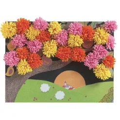 Een vrolijk pompon knutselsetje van het Franse merk Djeco voor jonge kleuters. Met dit creatieve setje kunnen kinderen illustraties versieren door de zelfklevende cilinders op de illustraties te plakken. Haal vervolgens het transparante laagje eraf voor een ware explosie van pompons!