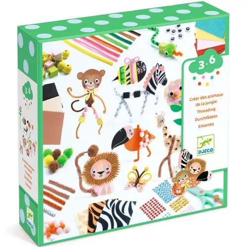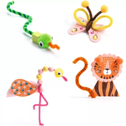 Knip, plak, vouw en rijg verschillende materialen aan elkaar om tot grote of kleine jungledieren te komen. Door het chenilledraad, de viltvellen, de kralen, pompons en wiebelogen ziet elk dier er al snel prachtig uit!