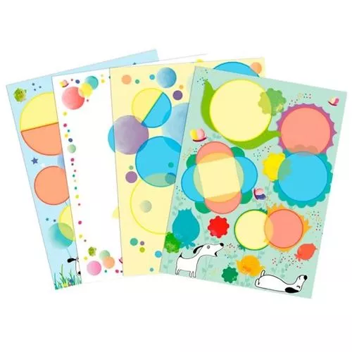 Plaats de stickers op de voorgeïllustreerde achtergronden om de kunstwerkjes compleet te maken. De achtergronden en stickers zijn herbruikbaar.