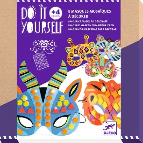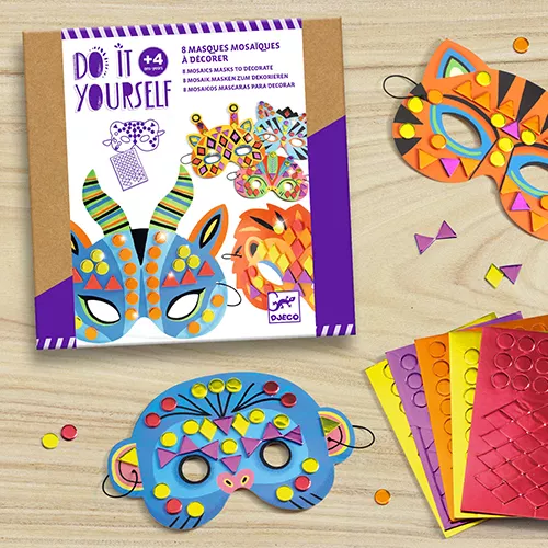 Versier de jungle dierenmaskers met deze knutselset ‘Jungle Animals’ van het Franse merk Djeco. Plak de mozaïeken stickers op de maskers en schitter door de jungle!